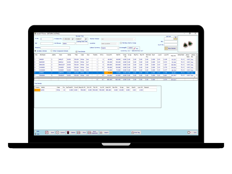 Define your own jewelry manufacturing processes & workflow in Jewels® Prime to match your production system with order requirements. Orders & jobs can be tracked efficiently keeping an eye at job & order progress status. Jobs can be rejected and reordered. Material consumed can be defined, loss can be calculated. Quality Control, Tagging with Barcode, RFID tags, sales, exports, consignments, payables, receivables can be easily managed with the help of Jewels® Prime.
